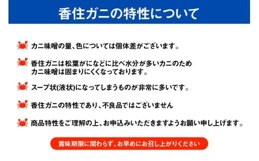 ※カニ味噌の量・色については個体差がございます。また、香住ガニは松葉がになどに比べ水分が多いカニのため、カニ味噌は固まりにくく、スープ状(液状)のものもございますが、不良品ではございません。商品特性をご理解の上、お申し込みいただきますようお願いいたします。