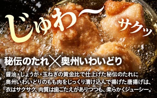 銘柄鶏「奥州いわいどり」のもも肉を使用し、創業以来守り続ける秘伝の黄金比(醤油×生姜×玉ねぎ)のタレにじっくり漬け込み、カラッと揚げた唐揚げです。衣はサクサクで、肉質はジューシー。