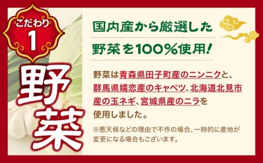 原材料名:豚肉(宮城県産)・キャベツ(群馬県嬬恋産)・玉ネギ(北海道北見市産)・ニンニク(青森県田子町産) ・ニラ(宮城県産)・小麦粉(国内製造)・純正ごま油 ・片栗粉(北海道産)・天日塩・砂糖・コーンスターチ ・トマトエキス・かつおエキス・香辛料/調味料(アミノ酸等) ・酸味料(一部に大豆を含む)