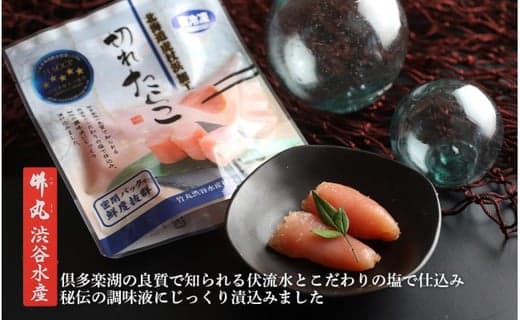 倶多楽湖の良質で知られる伏流水とこだわりの塩で仕込み、秘伝の調味液にじっくり漬込みました。100gずつ密閉パックされていますので、使いたい時、使いたい分だけ解凍出来る便利なたらこです。