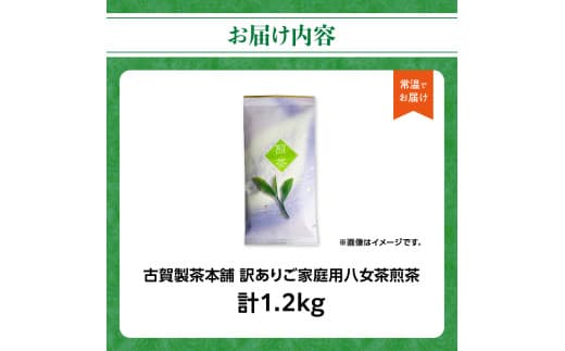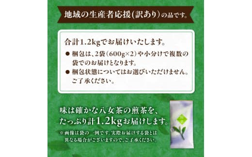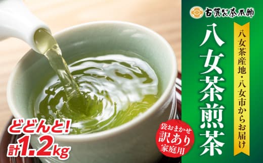 袋はおまかせ!自宅や職場でで飲むものだから袋は気にしない!という方におススメ!古賀製茶本舗 訳ありご家庭用八女茶煎茶 どどんと1.2キロ 八女茶 大容量 煎茶 福岡県 特産品 健康 茶葉 お茶 パック 緑茶