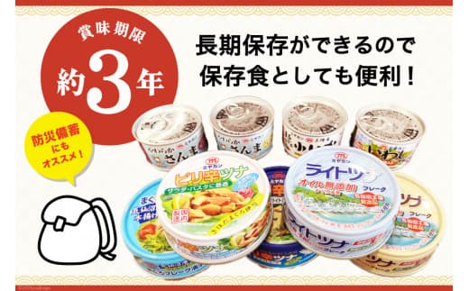 ピリ辛ツナ缶をはじめ、ライトツナ缶や、さば缶、さんま缶などミヤカンで人気の缶詰のバラエティー豊かなセットです。