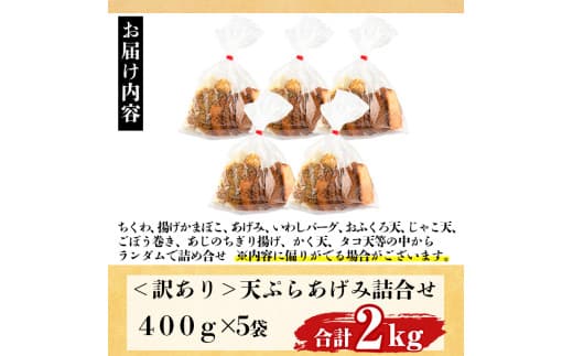 形は不揃いですが品質や味には全く問題ございません!訳あり さつま揚げ 天ぷら あげみ 詰合せ(合計2kg・400g×5袋)すりみ さつまあげ かまぼこ じゃこ天 ちくわ 蒲鉾 おつまみ おかず 弁当 惣菜 おでん 鍋 魚 魚介 国産 宮崎県 門川町【KI-8】【イチマル食品加工有限会社】